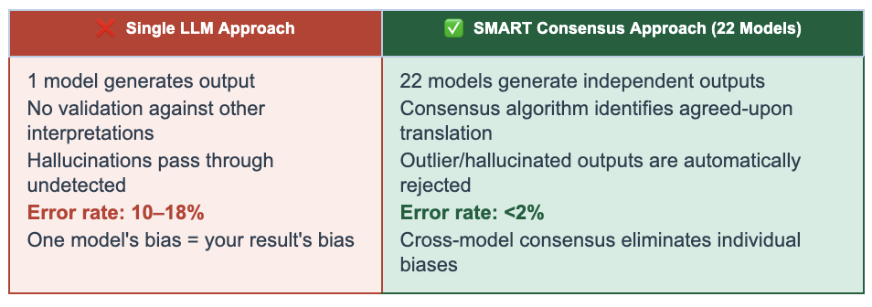 For medical and clinical content: the same two-layer approach applies. SMART flags where 22 models agree (precisely the passages most likely to contain terminological uncertainty) allowing reviewers to focus attention where it's needed rather than reviewing every line.