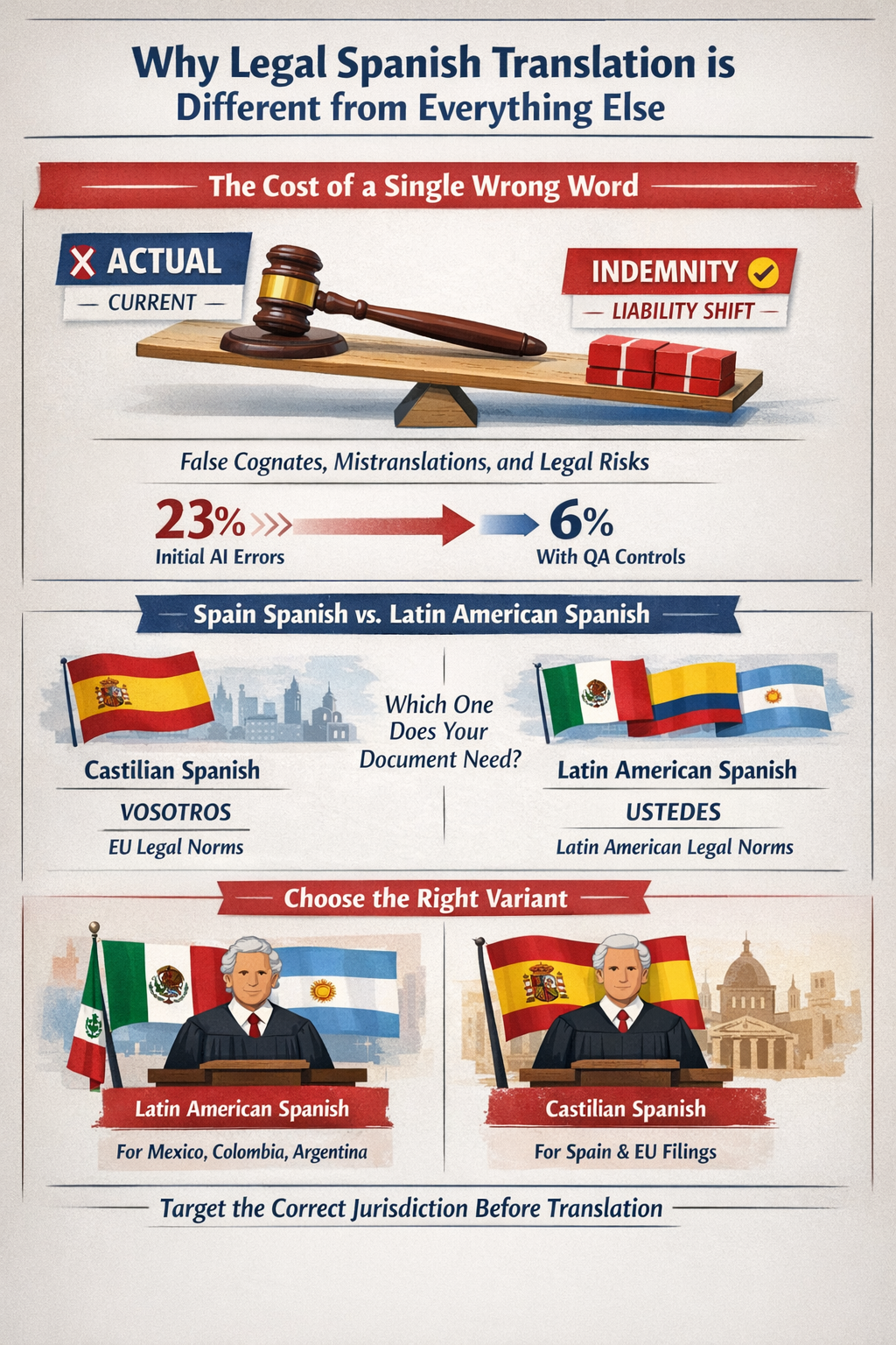 Spanish is not a single language for legal purposes. Spain uses the vosotros form and follows EU legal conventions, while Latin American jurisdictions (Mexico, Colombia, Argentina, and others) use ustedes and apply different legal frameworks, terminology traditions, and formality norms.