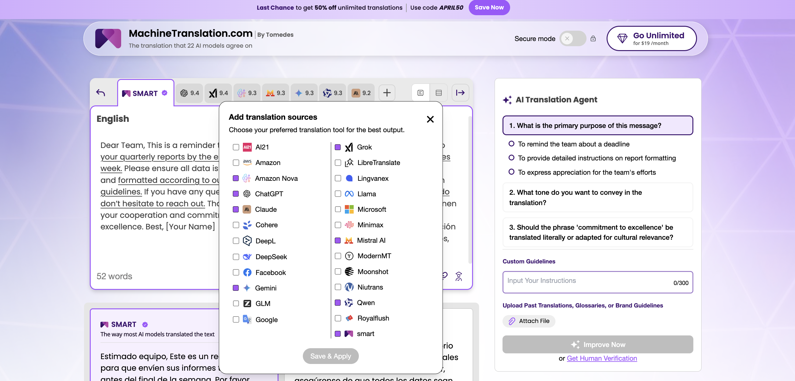 Selecciona el motor de traducción. MachineTranslation.com.com compara automáticamente los resultados de más de 20 modelos de IA para el par de idiomas elegido y recomienda el más adecuado para tu contenido. También puedes seleccionar un motor específico si tienes preferencia para tu tipo de documento (por ejemplo, textos legales, marketing o contenido técnico).