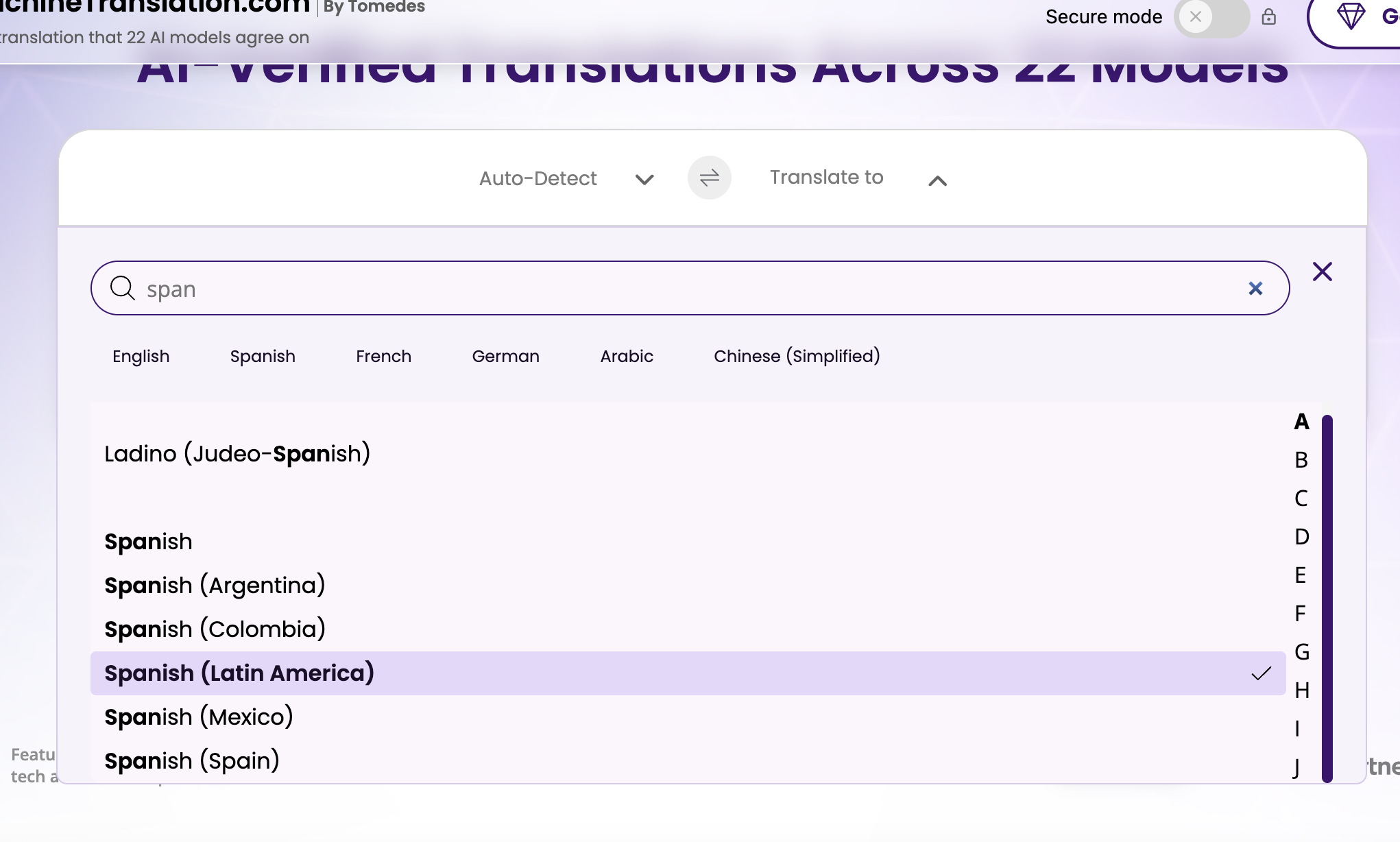 MachineTranslation.com permite comparar el resultado de más de 20 modelos de IA simultáneamente, lo que hace visibles las diferencias de registro entre motores. También permite seleccionar la variante de español latinoamericano, que aplica normas regionales más cercanas al español formal mexicano. Puedes configurar estas preferencias directamente desde la página de traducción de inglés a español.