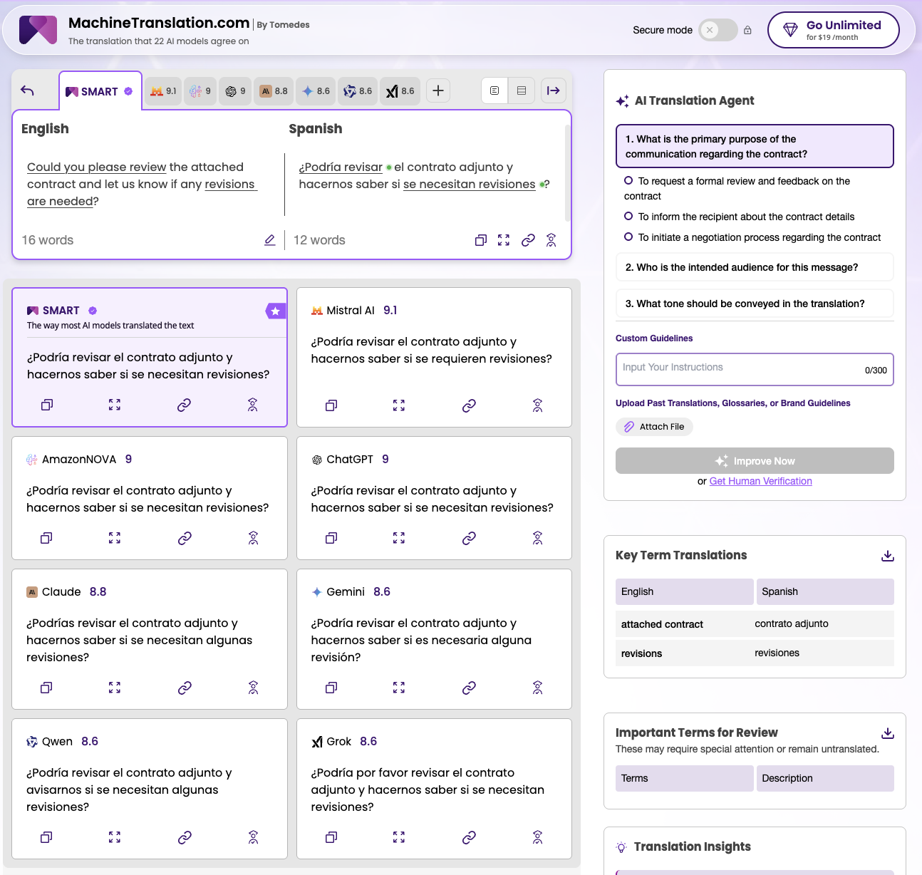 MachineTranslation.com compara automáticamente los resultados de más de 20 modelos de IA para el mismo par de idiomas. Para textos en español dirigidos a contextos formales, esto permite identificar de inmediato si un motor produce "puedes" mientras otro produce "podría usted", lo que indica que la oración fue interpretada de forma distinta según el corpus de entrenamiento de cada modelo. El usuario elige la versión que corresponde al registro que necesita, en lugar de confiar en que un solo motor haya tomado la decisión correcta.