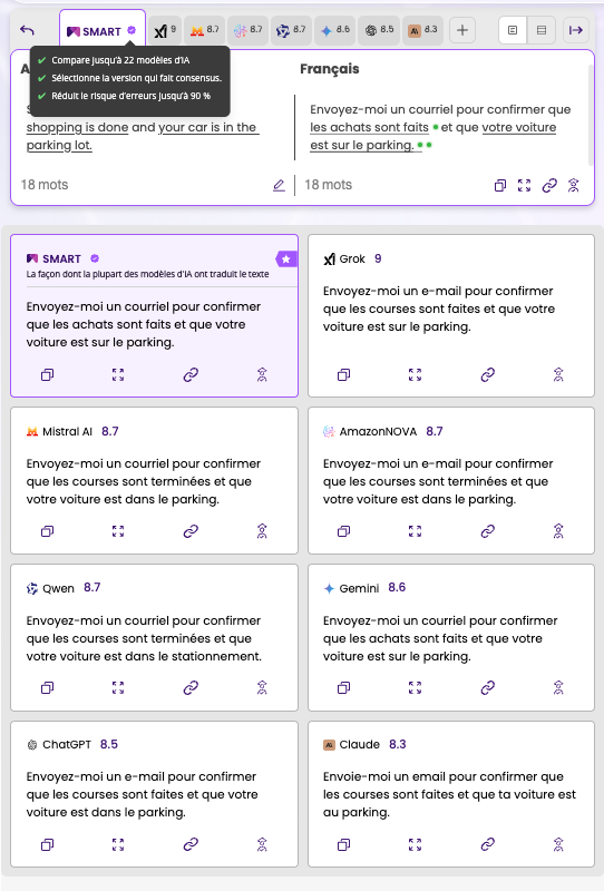 Lorsque vous faites tourner le même contenu simultanément sur cinq moteurs de traduction IA ou plus et que vous comparez les sorties côte à côte, la divergence sur les marqueurs de vocabulaire régionaux devient immédiatement apparente. Vous voyez en un seul écran que le moteur A a choisi "e-mail" pendant que le moteur B a choisi "courriel", que le moteur C a rendu "parking" pendant que le moteur D a écrit "stationnement". Ces choix sont invisibles avec un outil mono-moteur. Ils sont évidents avec une comparaison.
