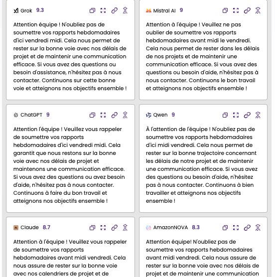 ● Le résultat : voir plusieurs versions côte à côte permet aux rédacteurs de valider le contenu dans 78 % des cas dès la première lecture. Cela réduit de 27 % le temps consacré au choix entre les options.