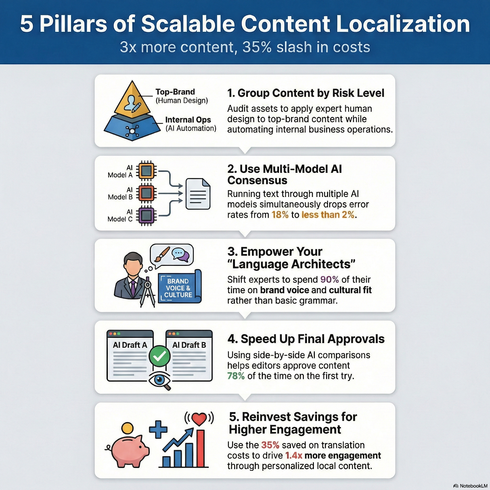 Pour croître rapidement, il est impossible de s’appuyer sur des méthodes de traduction manuelles, lentes et fastidieuses. À la place, vous avez besoin d’un système intelligent qui traite chaque type de contenu avec le niveau d’attention qu’il mérite.