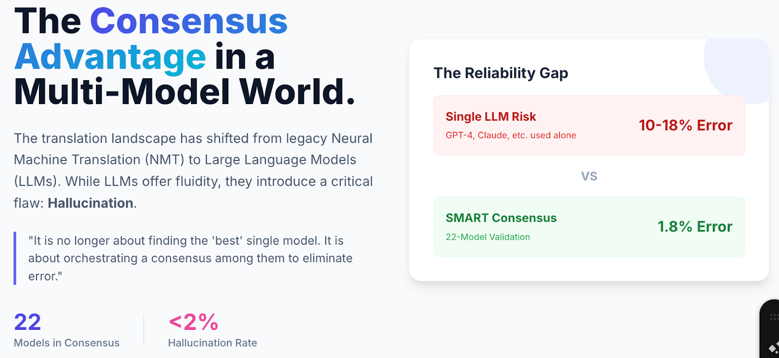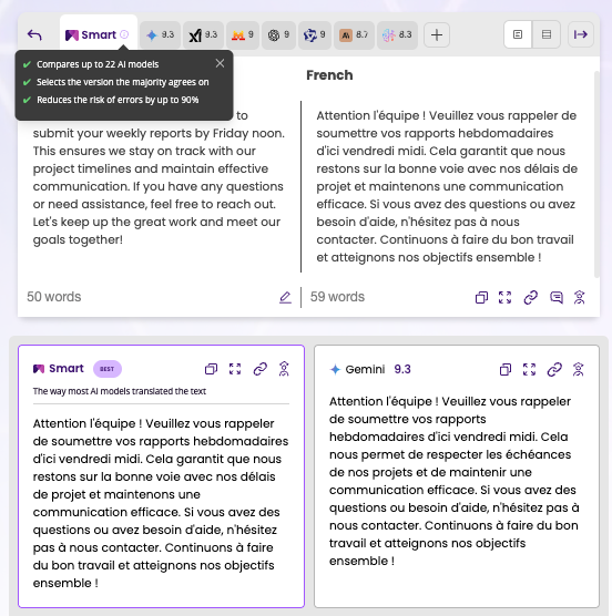 ● La méthode du consensus : utilisez un système comme SMART pour faire collaborer simultanément plusieurs modèles d’IA de premier plan. En faisant passer le texte par plusieurs modèles et en retenant ce sur quoi la majorité s’accorde, le système augmente automatiquement le score de précision de vos traductions.