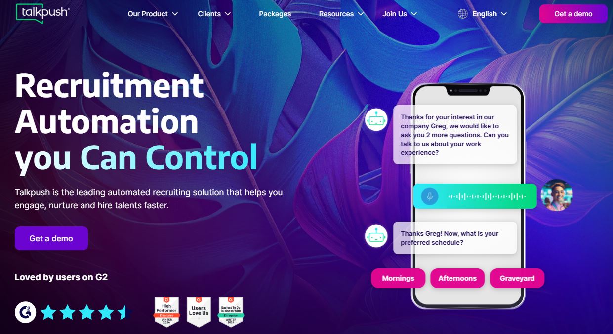Talkpush omomba’apo ijeheguiete tembiaporã jeporavorã ñemongeta chatbot heta ñe’ẽme ndive ohesa’ỹijóva, ombohapéva ha ombohapéva candidato-kuérape. Oipytyvõ contratación de alto volumen mercado global-pe oñomongeta umi postulante ndive iñe'ê teépe. Ko sistema oñembojoaju avei hekopete umi CRM ha ATS plataforma ndive.