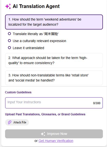 MachineTranslation.com mengubah hal itu dengan Agen Terjemahan AI-nya. Setelah terjemahan pertama Anda, sistem akan mengajukan tiga pertanyaan sederhana untuk menyempurnakan hasilnya—seperti memilih antara nada formal atau kasual. Agen tersebut juga akan mengingat preferensi Anda jika Anda mendaftar, sehingga pekerjaan di masa mendatang menjadi lebih lancar.