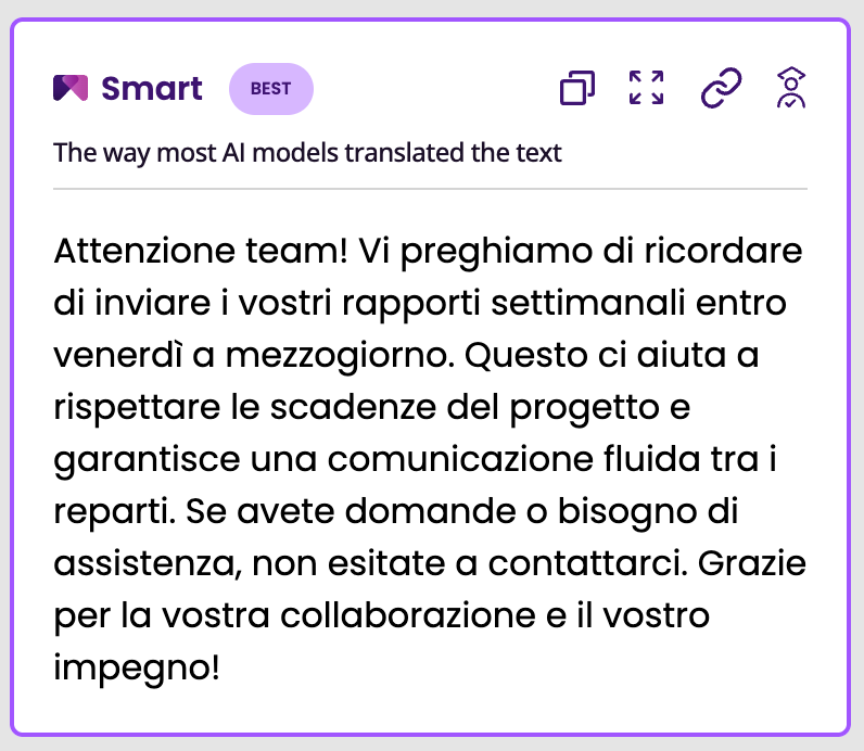 機械翻訳.com単にテキストをさまざまなAIモデルに通すだけでなく、頭いい可能な限り最高の翻訳を提供するためです。