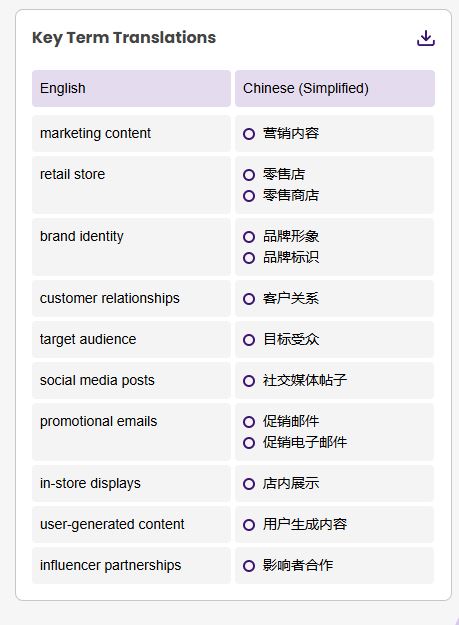 ის ასევე გთავაზობთ საკვანძო ტერმინების თარგმანების ფუნქციას. ეს ინსტრუმენტი განსაზღვრავს 10-მდე ძირითად ინდუსტრიულ ტერმინს და აჩვენებს მათი თარგმნის სხვადასხვა გზას. ეს იდეალურია, თუ ბრენდ-სპეციფიკურ კონტენტს ქმნით ან იურიდიულ ან სამედიცინო სფეროებში მუშაობთ.