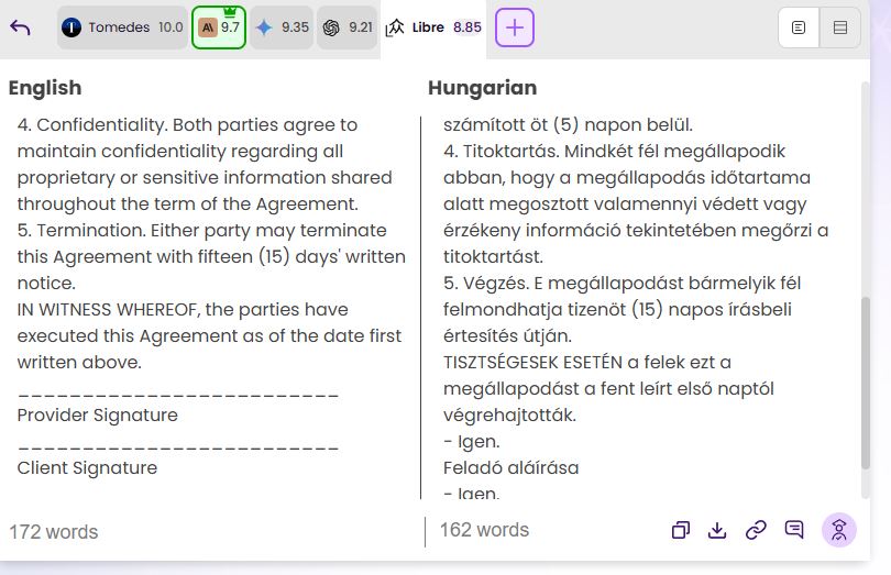 თქვენ შეგიძლიათ ზუსტად აირჩიოთ, რომელი ხელოვნური ინტელექტის ძრავები გამოიყენოთ, თითოეული მათგანი შესაბამისობის სტატუსით იქნება მონიშნული. ჯანდაცვის, ფინანსური თუ იურიდიული სფეროს წარმომადგენელი ხართ, სრული კონტროლი გაქვთ. და სეგმენტირებული ორენოვანი ხედი საშუალებას გაძლევთ გადახედოთ თარგმანებს სტრიქონ-სტრიქონი, რაც აუცილებელია ხარისხის უზრუნველყოფისთვის.