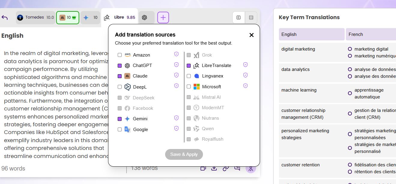 Qwen បង្ហាញពីប្រសិទ្ធភាពខ្ពស់ក្នុងការបកប្រែជាភាសាអង់គ្លេសទៅបារាំង ដោយសម្រេចបានពិន្ទុជិតល្អឥតខ្ចោះក្នុងភាពត្រឹមត្រូវ (9.5/10) វេយ្យាករណ៍ (10/10) និងភាពស្មោះត្រង់តាមបរិបទ (10/10)។ ការបកប្រែរបស់វាមានភាពច្បាស់លាស់ ដោយប្រើពាក្យស្តង់ដារឧស្សាហកម្មដូចជា "អតិថិជន parcours" និង "omnicanal" ខណៈពេលដែលរក្សាបាននូវវេយ្យាករណ៍ល្អឥតខ្ចោះ និងឃ្លាធម្មជាតិ។ ទិន្នន័យនេះបានកំណត់យ៉ាងច្បាស់ថា Qwen ជាគំរូដែលអាចទុកចិត្តបានជាងមុនសម្រាប់ការបកប្រែកម្រិតវិជ្ជាជីវៈ ជាពិសេសនៅក្នុងវិស័យឯកទេសដូចជាទីផ្សារឌីជីថល។