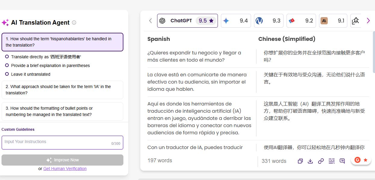 MachineTranslation.com’s atiynin askha AI motormanta lluqsiykuna huñuys tikraykunata chiqan kaqta chanta contextualman hina kaqta qhawan. Paypa aswan riqsisqa ruwayninkuna, kayhina AI Tikray Agente chaymanta segmentado iskay simipi UI, ruwaqkunata atiyta qun tikraykunata chiqa pachapi allinchaypaq, sapa simi munasqa tonowan, estilowan chaymanta contexto culturalwan tupachisqa kaqta qhawaspa. Qhawarisunchis imaynatachus MachineTranslation.com aswan allinta ruwan chino simita t’ikraypi imaymana industriakunapaq chaymanta casos de uso kaqpaq.