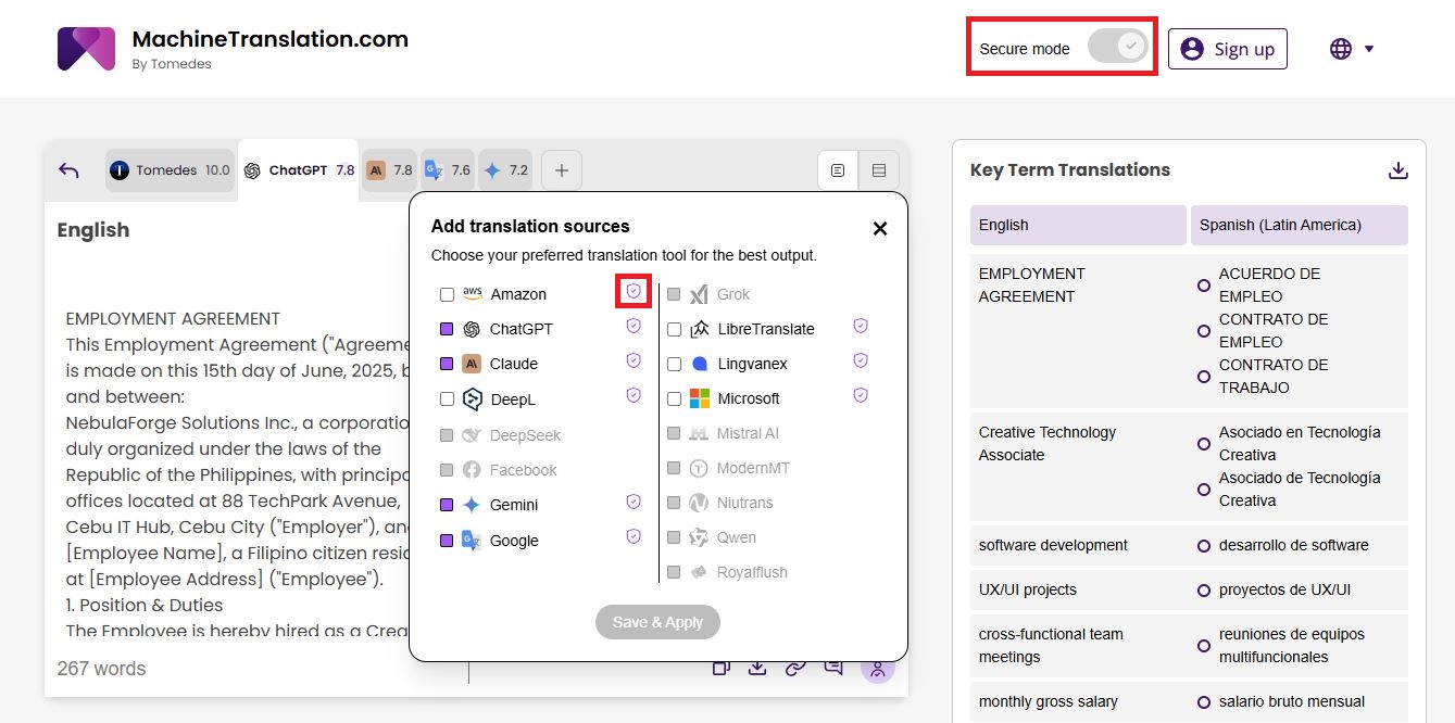 Katera prevajalska orodja so varna za občutljive informacije strank? MachineTranslation.com z aktiviranim varnim načinom ponuja neprekosljivo kombinacijo varnosti, hitrosti in profesionalne kakovosti prevajanja.