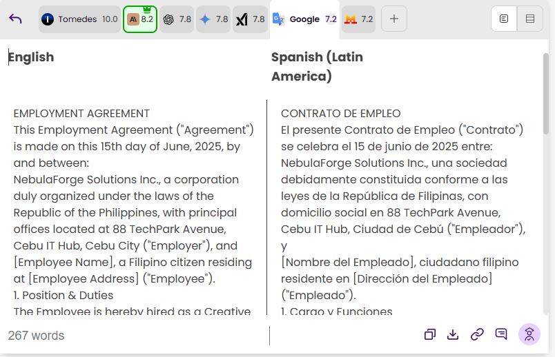 Vedno uporabite segmentirani dvojezični pogled, da dvakrat preverite svoj prevod. To orodje prikazuje vsak stavek izvirne in prevedene vsebine drug ob drugem, kar olajša odkrivanje neskladij ali napak. To je hiter in učinkovit način za preverjanje integritete občutljivih informacij.