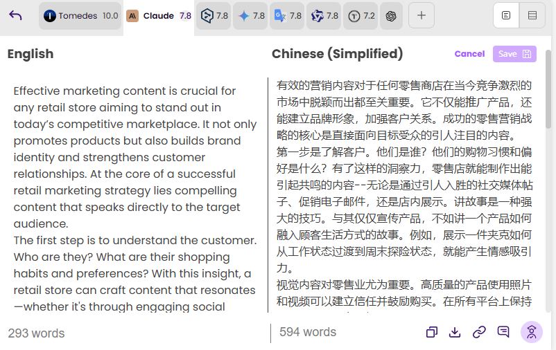 Si ka duwan ChatGPT iyo Gemini, kuwaas oo turjumaadda u arka sifo dhinac ah, MachineTranslation.com waxay si gaar ah diiradda u saartaa. Waxaad isbarbar dhigi kartaa wax soo saarka matoorro badan, dib u eegi kartaa isbeddellada codka, xitaa waxaad codsan kartaa Shahaadada Aadanaha marka aad u baahan tahay saxnaan 100%. Taasi waa sababta ay ugu kalsoon yihiin shirkadaha sharciga, suuqgeeyayaasha, iyo kooxaha wax soo saarka adduunka oo dhan.