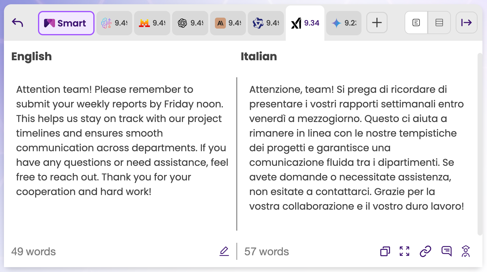 Waxay isku daraysaa: Waxay si dhakhso ah u turjumaysaa qoraalkaaga iyadoo adeegsanaysa ilaa 22 nooc oo AI ah oo ugu sarreeya (oo ay ku jiraan Google, DeepL, iyo ChatGPT) isku mar.