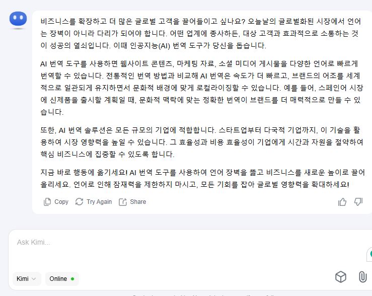 ističe u kreativnim i konverzacionim prevodima, posebno za sadržaj koji je okrenut potrošačima. Na primer, Kimi.ai je prirodno preveo široko priznatu kinesku frazu „加油“ (samo tako nastavite) kao „화이팅“, popularan korejski termin koji prenosi ohrabrenje i pozitivnost. Ova sposobnost prilagođavanja idiomatskih izraza i očuvanja kulturnih nijansi čini ga izborom za reklame, kampanje na društvenim mrežama i emocionalno zanimljive materijale.