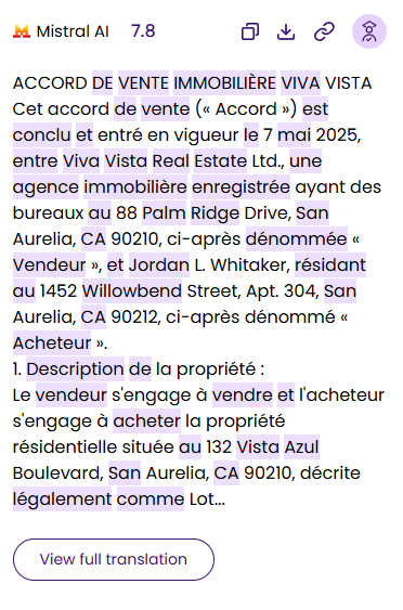 Mistral AI proizvodi solidan prvi nacrt, ali nije dovoljno rafiniran za formalne dokumente. Postigao je 92% u terminološkoj tačnosti, uglavnom zbog upotrebe „Accord de Vente“- važećeg termina, ali ne i zakonskog standarda „Contrat de Vente“. Pravilne imenice kao što je „San Aurelia“ bile su tačne (100% tačnost), a gramatika se razumno dobro držala na 94%, uprkos blago krutom izrazu kao što je „s 'engage à vendre."