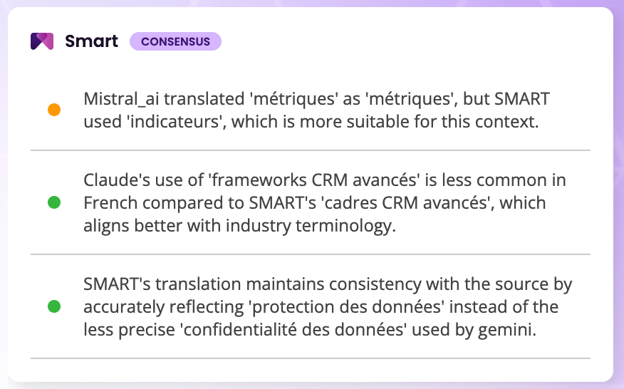 Majaribio ya ndani katika MachineTranslation.com yanaonyesha kwamba mbinu hii ya makubaliano hupunguza "ndoto" muhimu na "makosa ya tafsiri" kwa hadi 90%. Inakupa ubunifu wa ChatGPT na uaminifu wa Google, ikikaguliwa na mifumo mingine 20 ya AI - yote katika mfumo mmoja na kubofya.