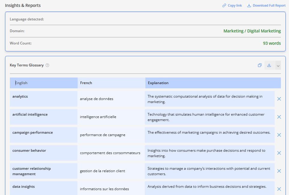Ezisekelweni ze-AI ezifana ne-MachineTranslation.com, amandla okulayisha amagama achaza amagama avumela abahumushi ukuthi benze ngokuzenzakalelayo ukusetshenziswa kwethemu okungaguquki, okuthuthukisa kakhulu isivinini nekhwalithi.